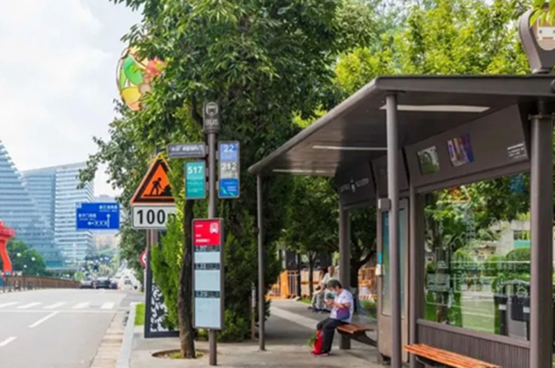 候車亭上方較高位置,設(shè)有公交線路牌,方便市民和游客在遠(yuǎn)處辨認(rèn),電子公交站牌在字體、顏色上都經(jīng)過優(yōu)化,讓各個(gè)年齡段都能輕松閱讀。
